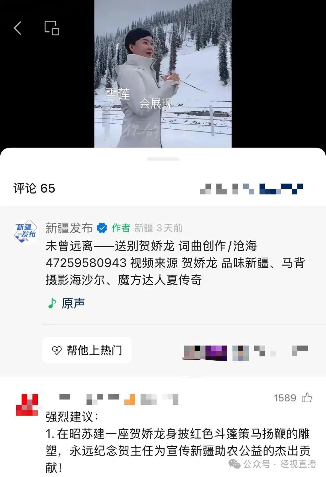 人们提起贺娇龙,会先想到“红衣策马”,人们纪念贺娇龙,自然也想复刻她“红衣策马”的形象。在“新疆发布”视频号《未曾远离——送别贺娇龙》视频的评论区,点赞最高的留言为,“在昭苏建一座贺娇龙身披红色斗篷策马扬鞭的雕塑,永远纪念贺主任为宣传新疆助农公益的杰出贡献!”