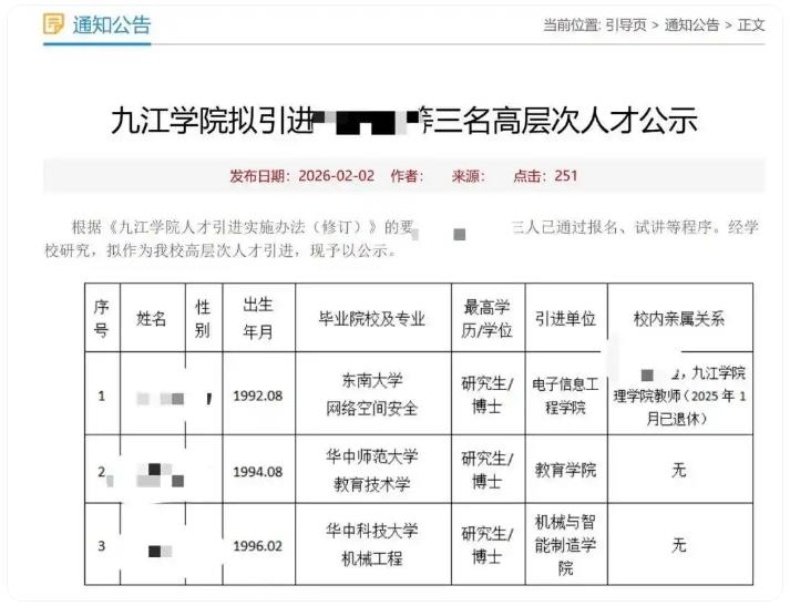 2月2日,九江学院发布一则拟引进三名高层次人才的公示,其中主动披露了一名拟引进人才与该校退休教师的父子关系,获得众多网友的好评。