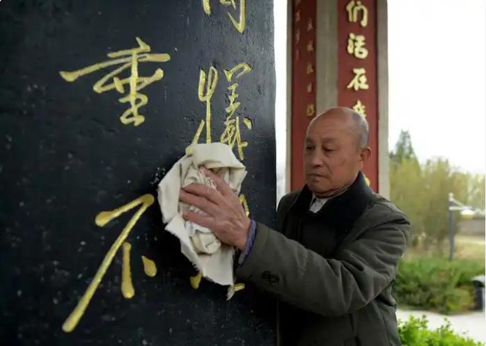 王志杰在河北省阜城县本斋纪念园擦拭纪念碑亭。图片来源:新华每日电讯