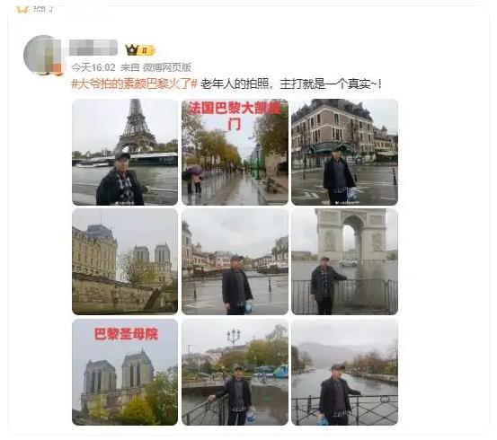 河南大爷、素颜巴黎,当这两个因素组合在一起,不用想,主打一个朴实。可以推测的一种走红路径及其逻辑是:元旦假期,不少想出境旅游的人在网上查攻略,偶然看到大爷默默无闻但又“别具一格”的照片,极限的对比差让人会心一笑,顿时从一万张精美照片中醒悟过来,随后加以评论、调侃、传播……