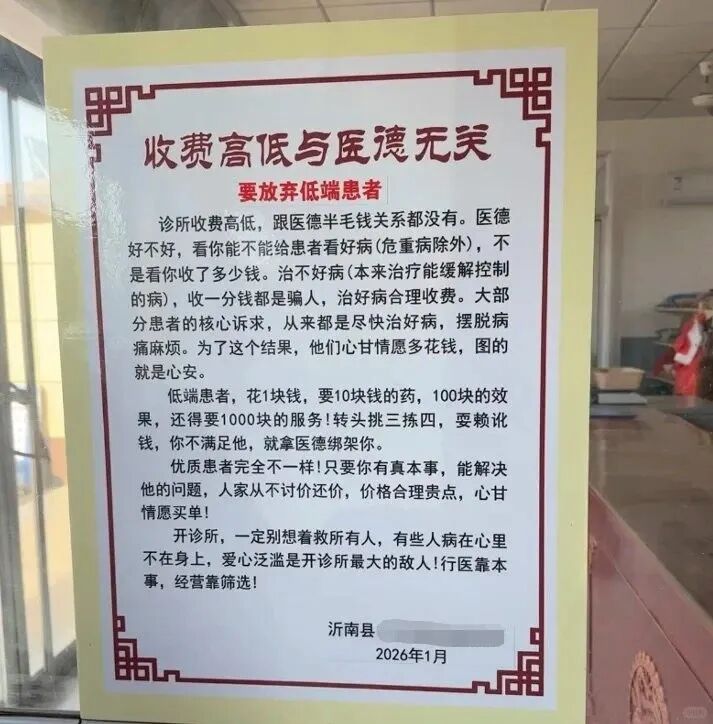 记者从告示上看到,“低端患者,花1块钱,要10块钱的药,100块的效果,还得要1000块的服务!转头挑三拣四,耍赖讹钱,你不满足他,就拿医德绑架你。”“优质患者完全不一样!只要你有真本事,能解决他的问题,人家从不讨价还价,价格合理贵点,心甘情愿买单!”